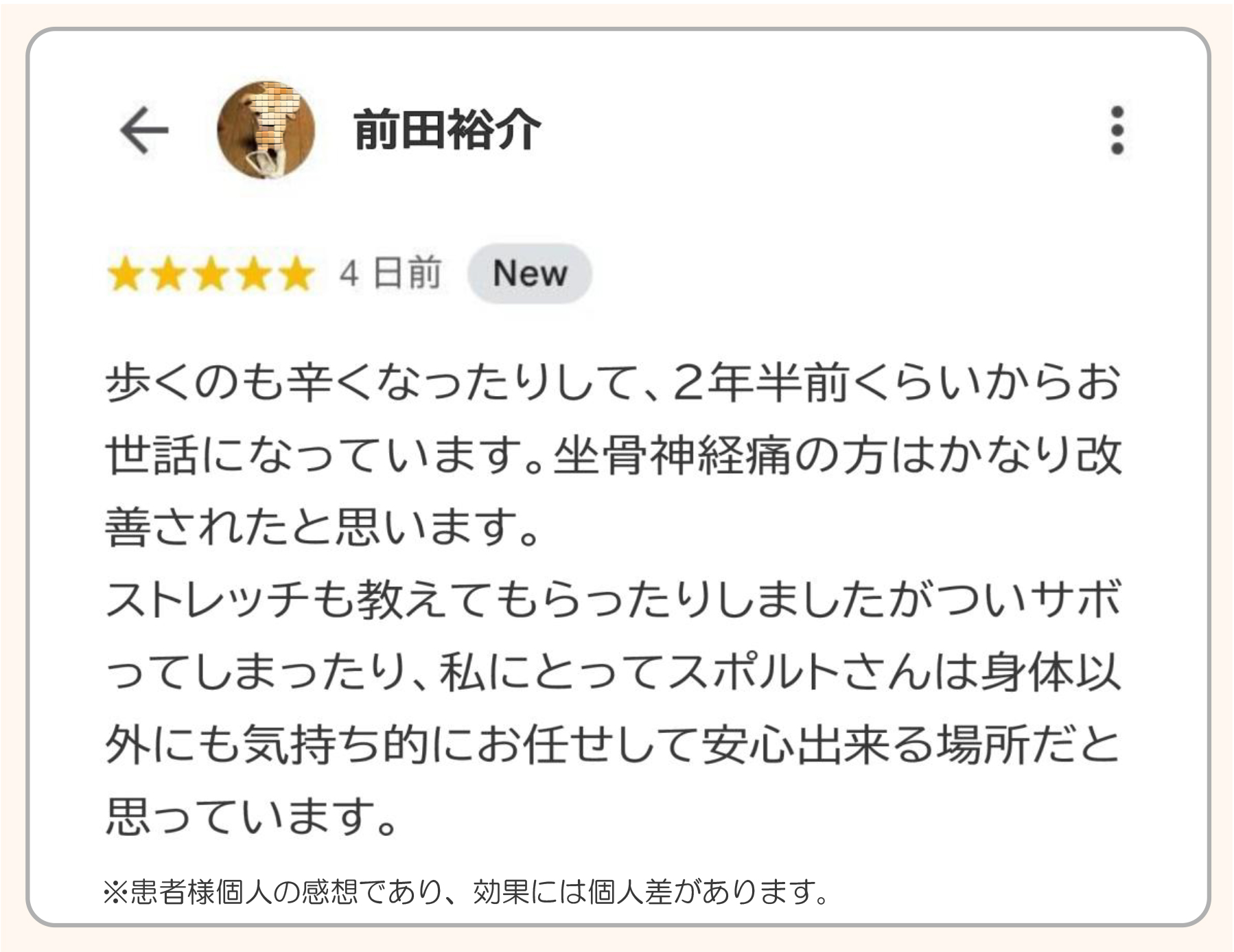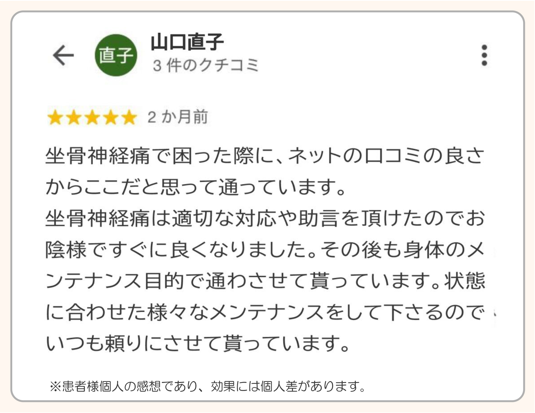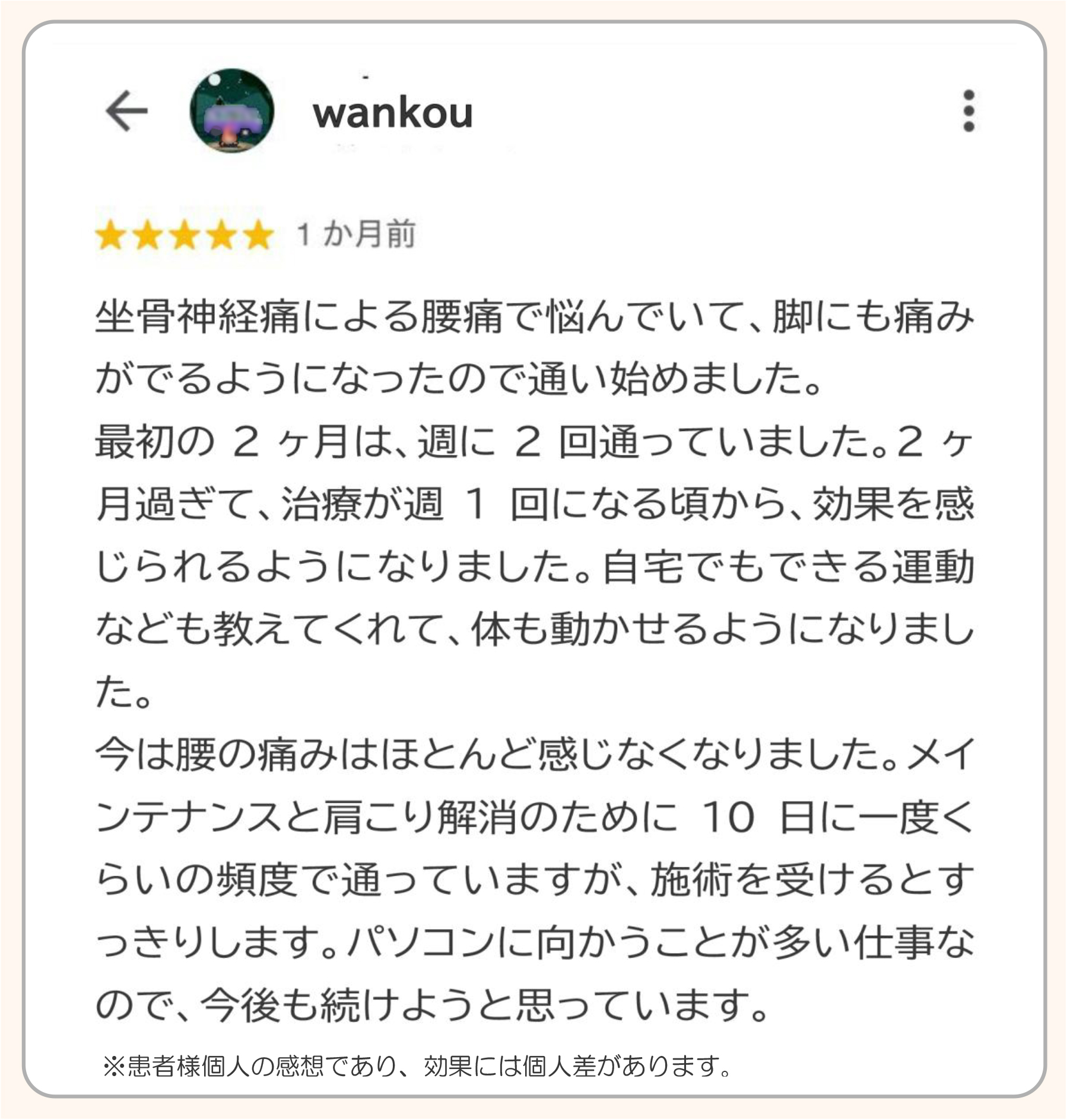 痛みが取れた時点で治療を終えられて、また同じような痛みの再発で再び来院される方がとても多くいらっしゃいます。